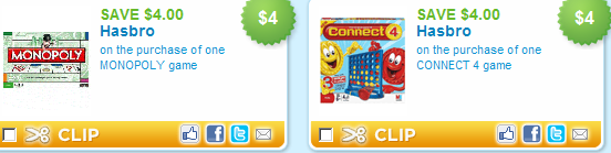 Head on over to Coupons.com this morning and check out some of the new coupons they posted. I am loving the Hasbro games ones, especially the $4 off any Connect Four. I am sure I have seen these in travel size versions, so we might just get lucky there. I also spotted .75 on one Solo product (great for the double coupon events), $3 off one Purina Pro Plan dog or cat food, $1 off of 3 Cambells on the go soups, and many more! I used zip 90210. Head on over here and see what you can score!